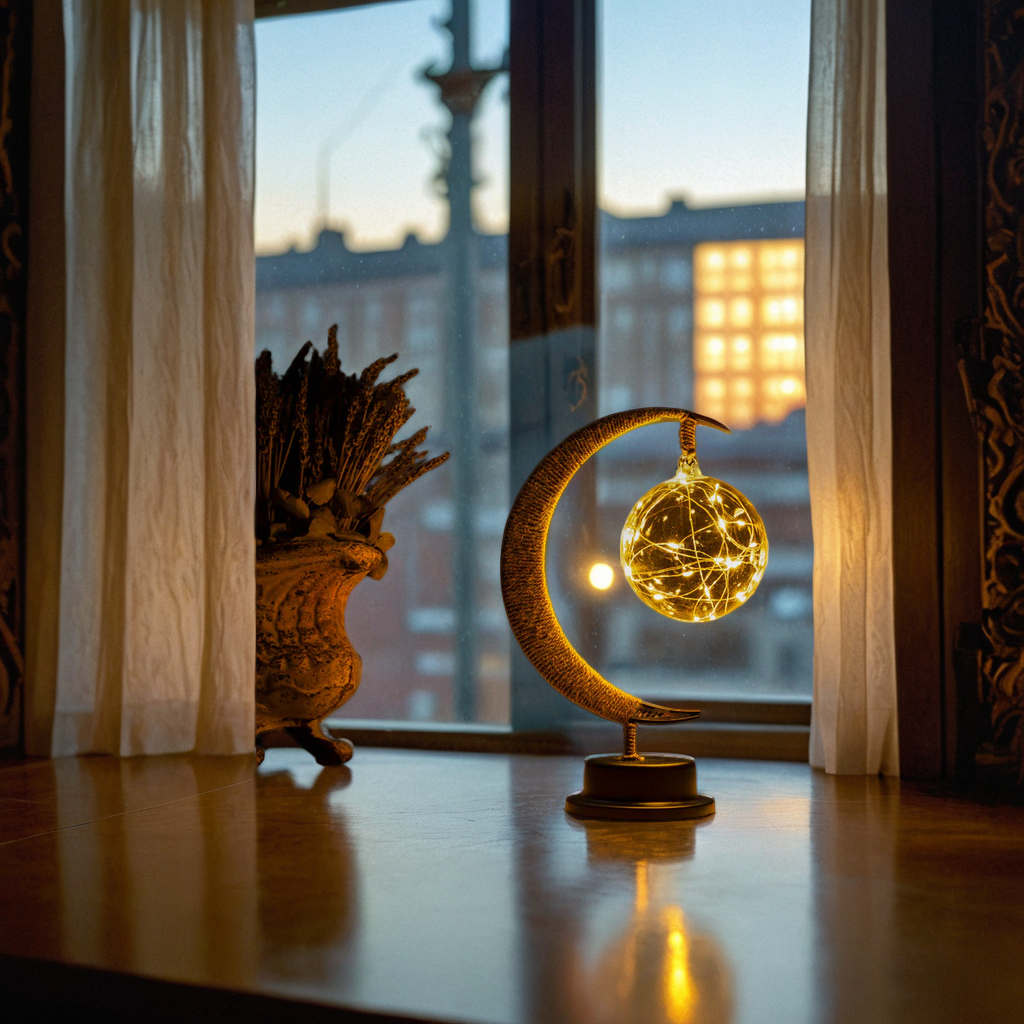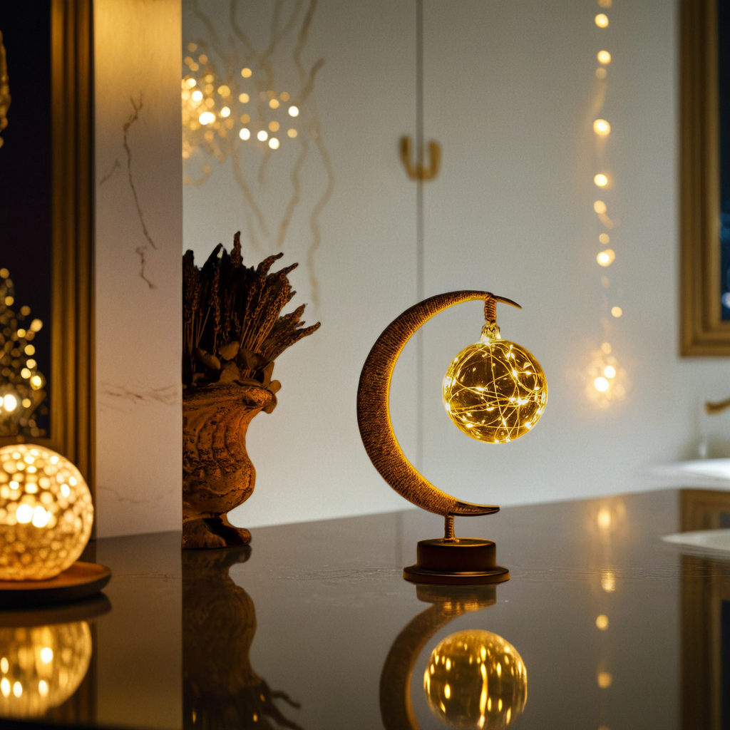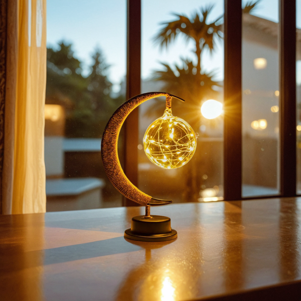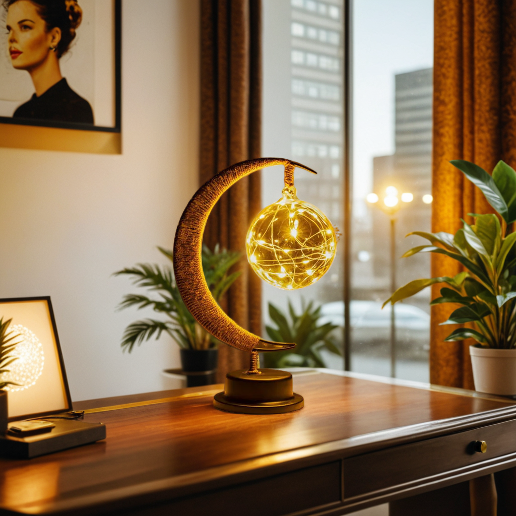 🌙 Diese bezaubernde Halbmond-Tischlampe mit der filigranen Lichterkugel schafft ein verträumtes Ambiente. Das warme, goldene Licht ist perfekt für eine gemütliche Dekoration auf Ihrem Nachttisch oder im Esszimmer.