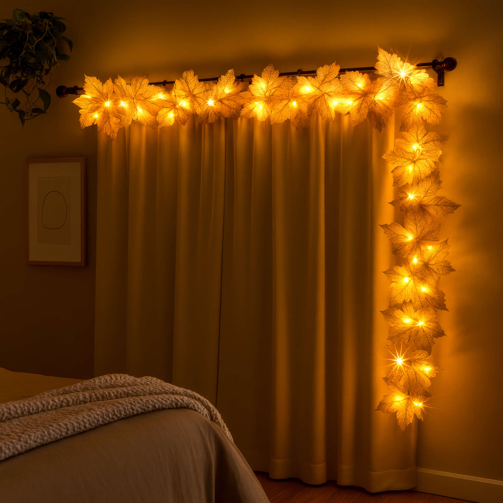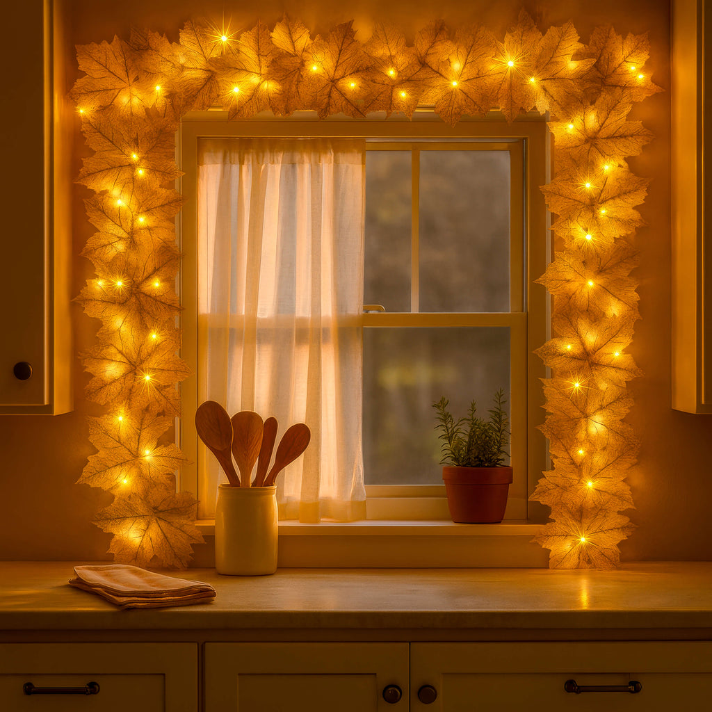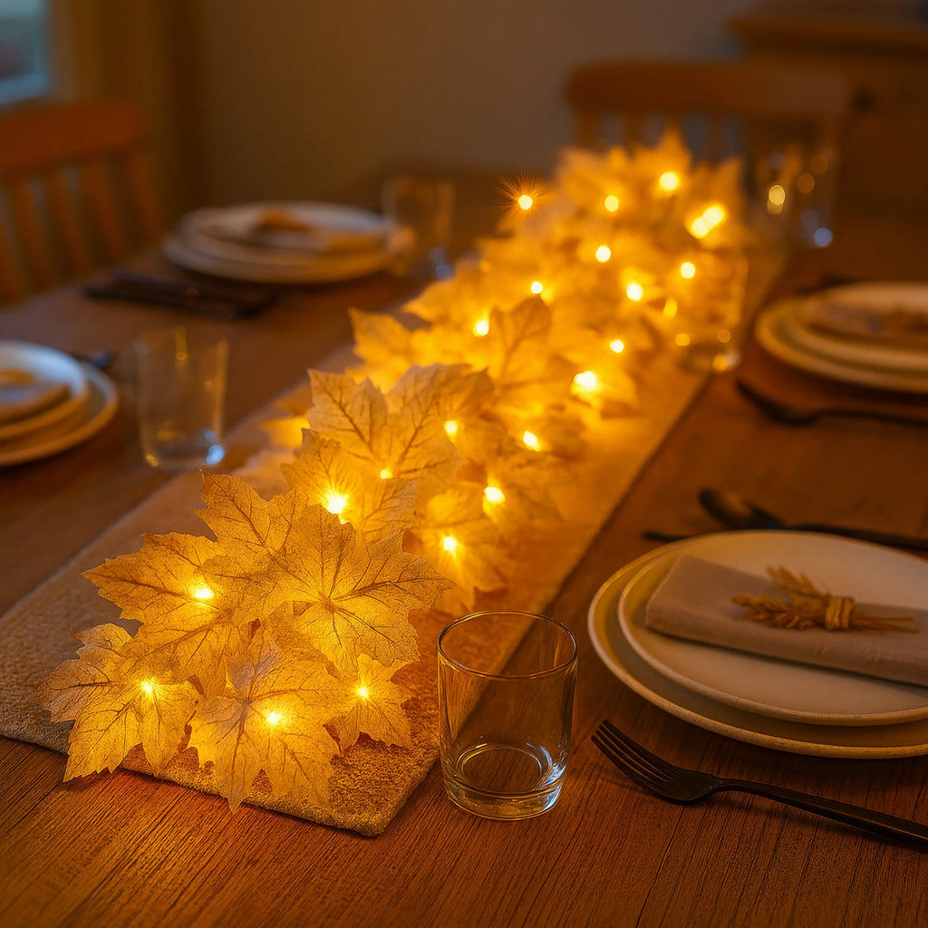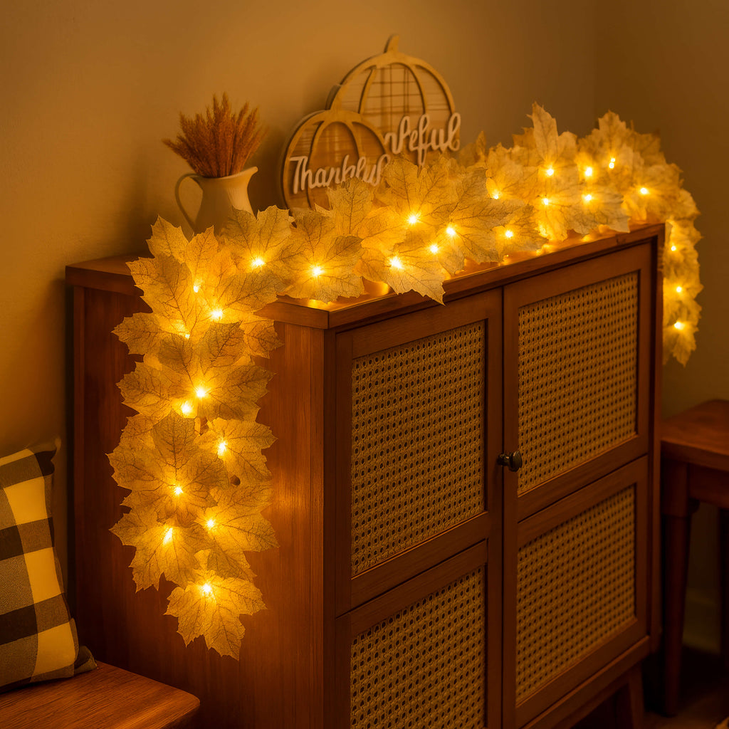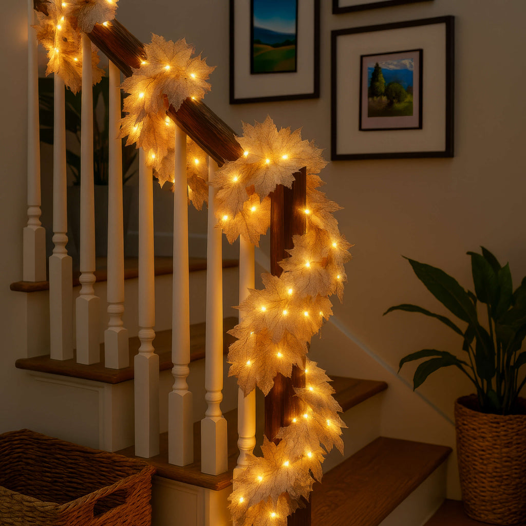 🍁 Diese LED-Blättergirlande bringt mit ihrem warmen, goldenen Leuchten eine festliche und gemütliche Atmosphäre an Treppengeländer, Türen oder Wohnbereiche.