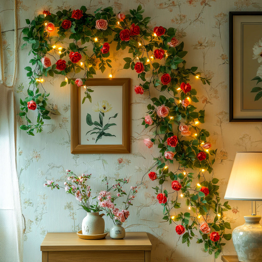 🌹 Diese beleuchtete Rosenranke verwandelt jede Wand in ein romantisches Highlight und schafft eine warme, verträumte Atmosphäre im Schlafzimmer.